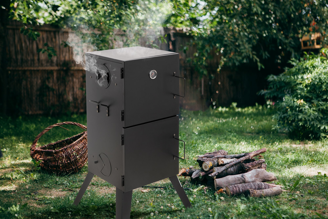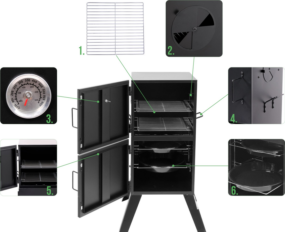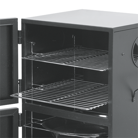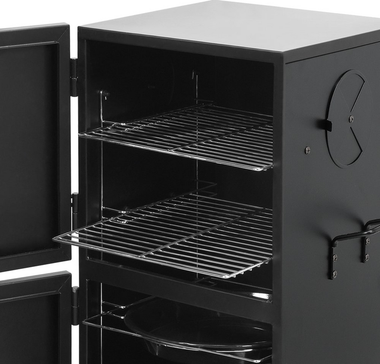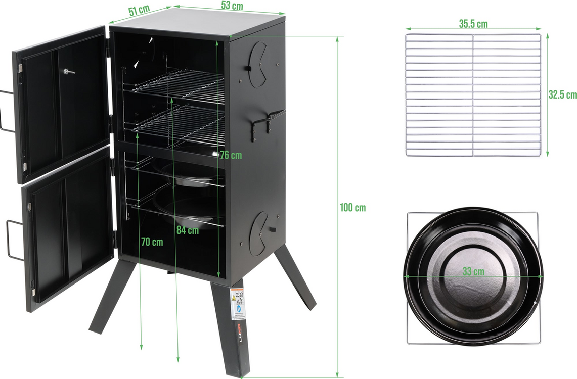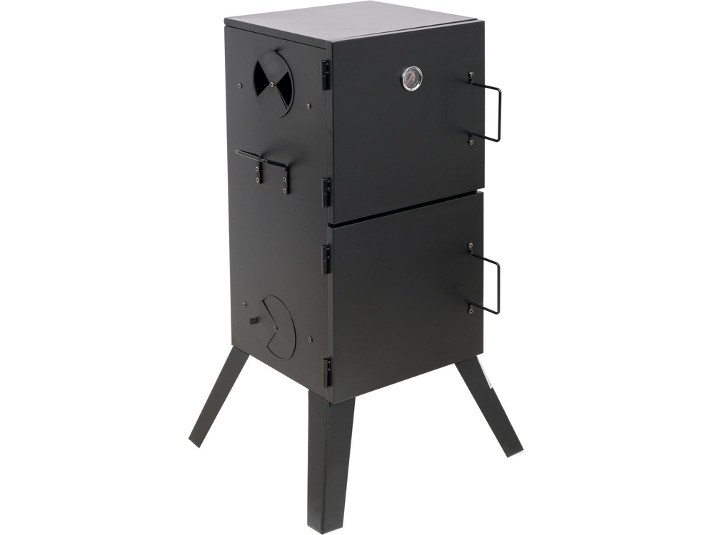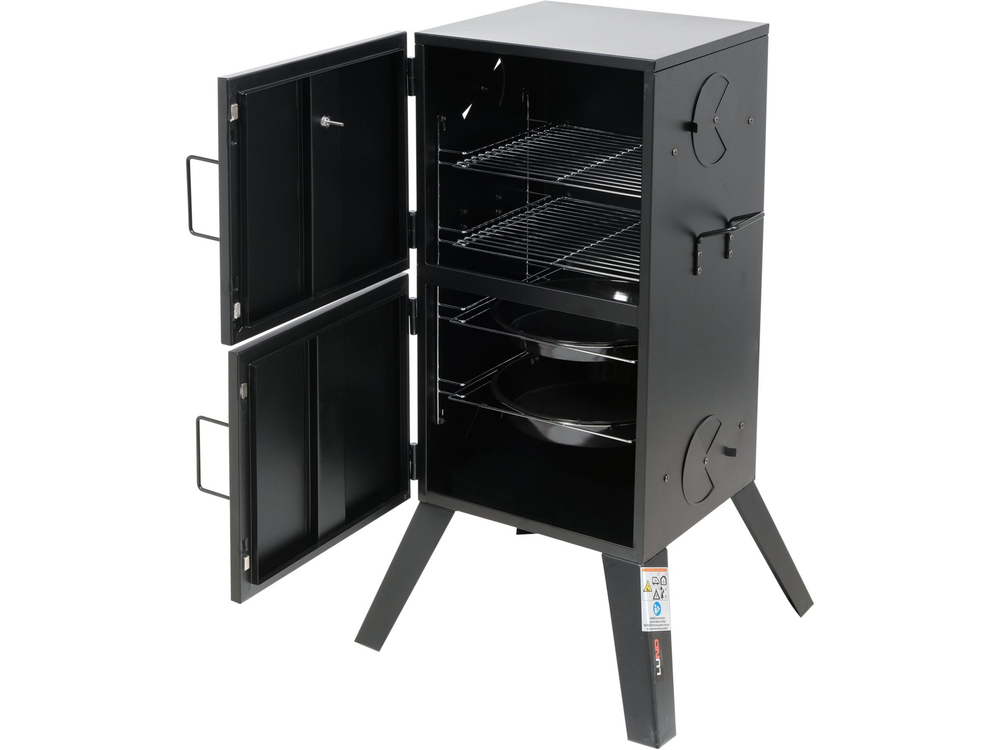 Grătar portabil cu fum pentru grădină echipat cu două tăvi și două grătare. Permite prepararea independentă a produselor tradiționale: mezeluri, cârnați, pește și brânzeturi afumate folosind 2 metode - la cald și la rece. Până la 4 orificii de ventilație permit controlul precis al focului și al fluxului de fum.