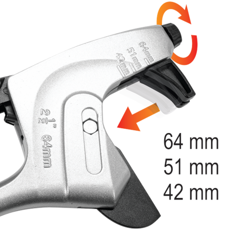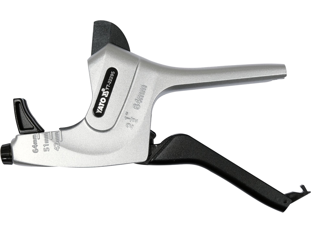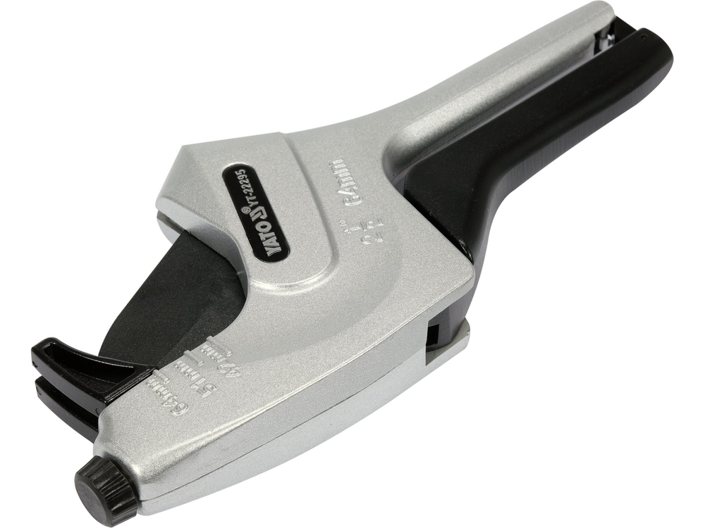 Foarfecă pentru tăierea țevilor din PVC și a altor materiale plastice (PP, PE, PU) și conducte. Un suport reglabil situat la capatul lamei ajuta la pozitionarea tevilor cu diametre de 40, 50 si 63 mm, ceea ce imbunatateste eficienta taierii. Lamă de înaltă calitate din oțel SK5. Lama este acoperită cu un strat de PTFE care îmbunătățește calitatea tăieturilor. Foarfecă folosită pentru instalații sanitare, lucrări de instalații și construcții.