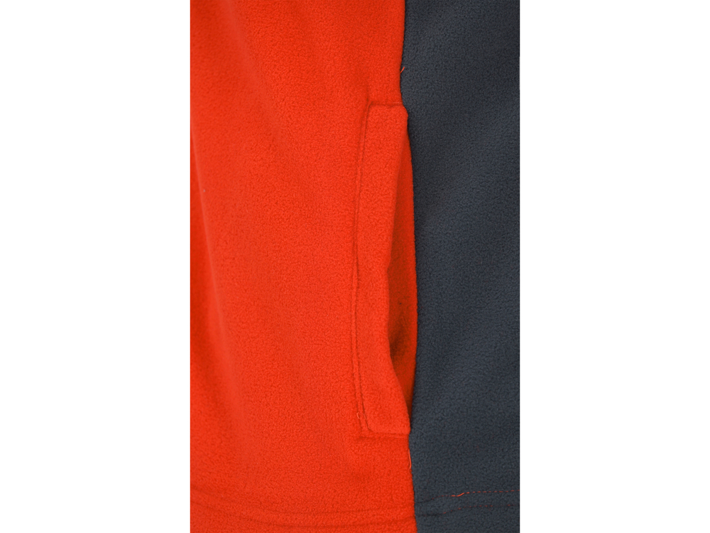 Bluza polară cu design în două culori, cu trei buzunare, dintre care unul cu fermoar. Materialul principal este poliester rezistent, cu o structură caracteristică polarului, care menține eficient temperatura corpului, în special în zilele reci.