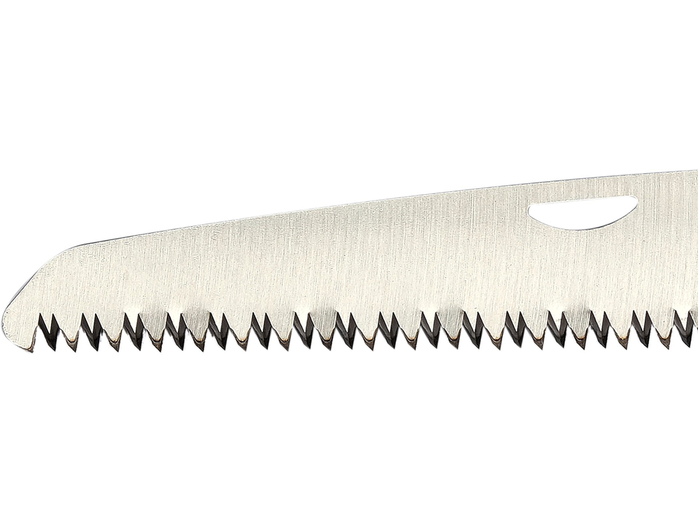 Fierăstrău pliabil din oțel SK5 cu conținut ridicat de carbon. Dinții fierăstrăului sunt căliți prin inducție și ascuțiți pe trei laturi. Acest lucru permite fierăstrăului să taie în ambele direcții. Lama este cromată și vopsită cu lac prin electroforeză. Mânerul este acoperit cu material TPR cauciucat pentru a facilita o prindere fermă. Fierăstrăul are un blocaj de siguranță pentru a preveni deschiderea accidentală.