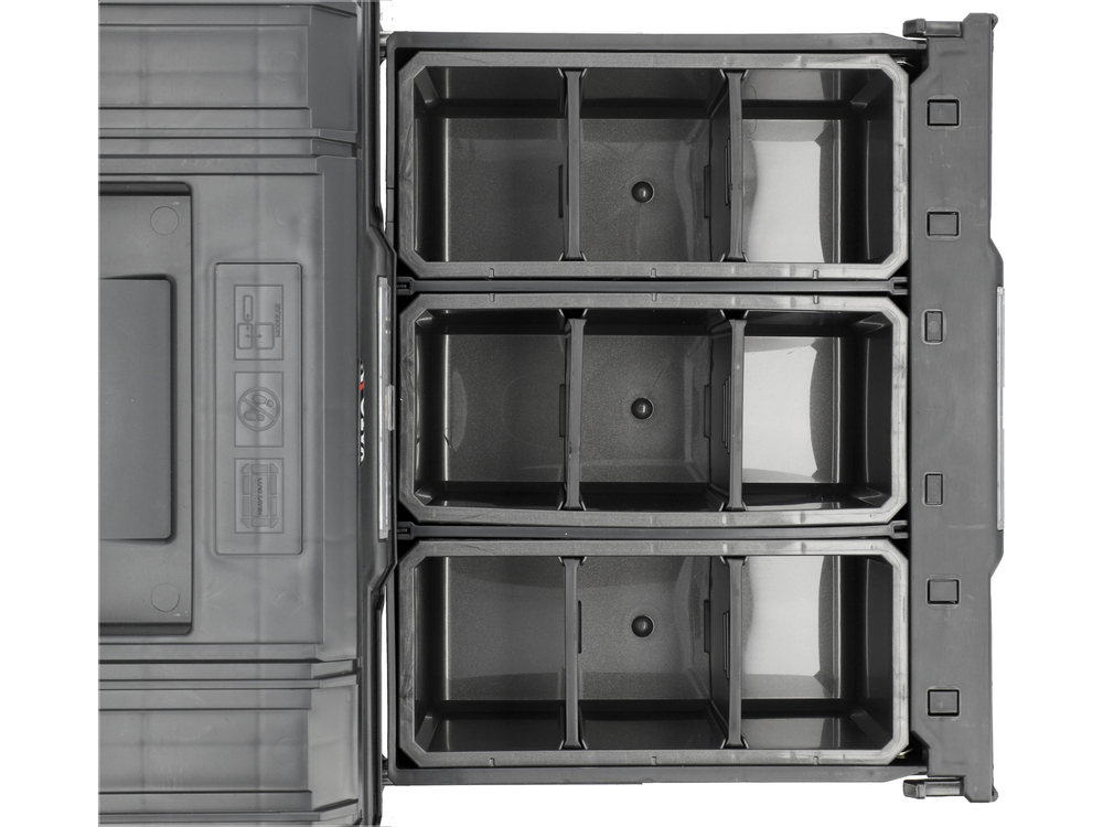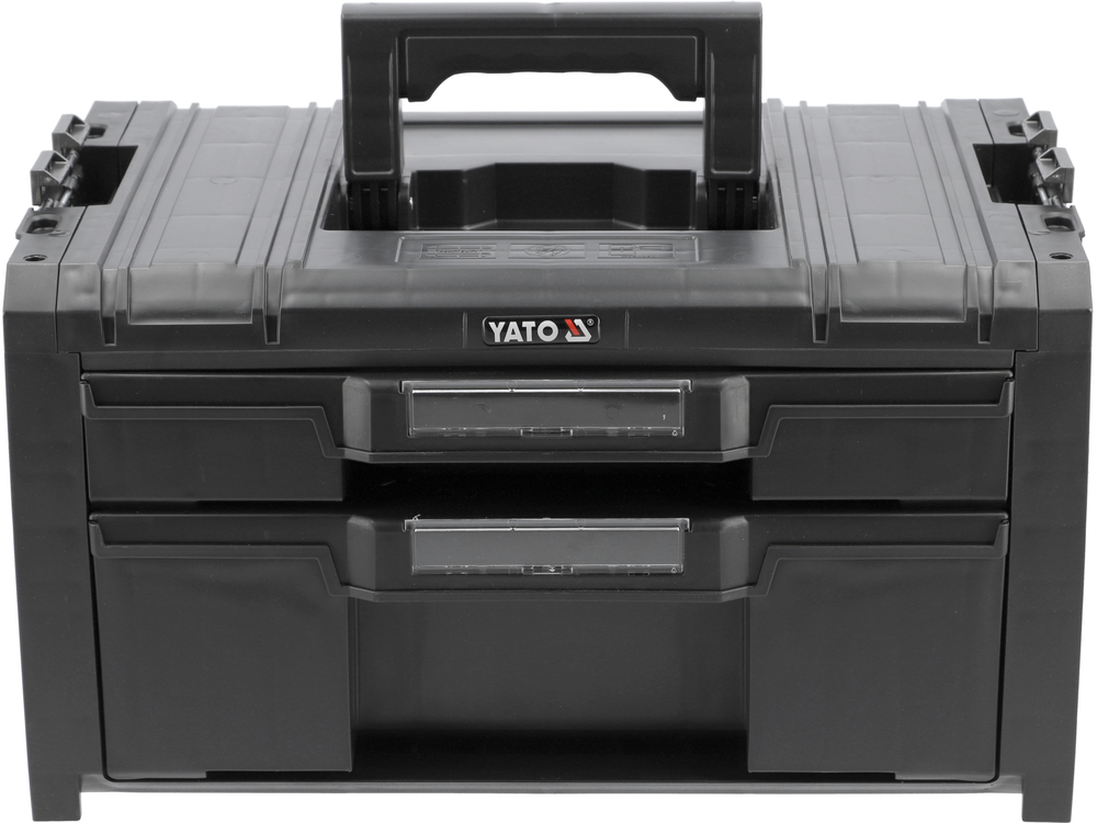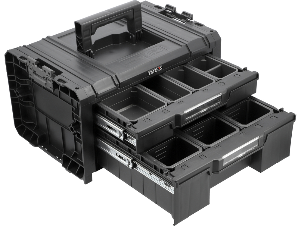 Cutia cu două sertare combină avantajele unei cutii mici și a unui organizator sigur. Sertarele sunt echipate cu pereți despărțitori și cutiuțe pentru obiecte mici. Sertarul de jos este mai mare. Poate fi folosit pentru depozitarea obiectelor mici sau - după demontarea pereților despărțitori - scule electrice mici. Diferitele dimensiuni ale sertarelor cresc semnificativ libertatea de a organiza un atelier mobil.