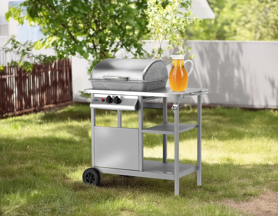 Grătar cu gaz cu două arzătoare pentru prepararea mâncărurilor în aer liber, cu o reglare comodă ce permite gătirea perfectă a mâncărurilor. Cele trei rafturi facilitează pregătirea mâncărurilor și depozitarea accesoriilor.