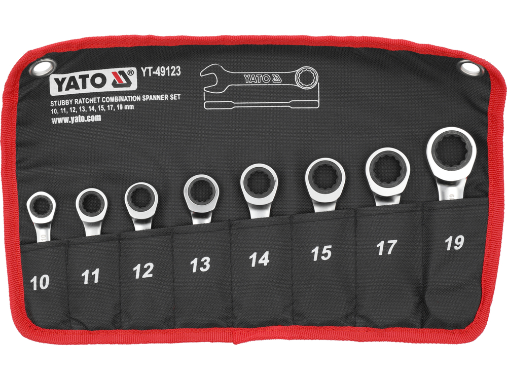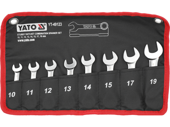 Setul de 8 chei fixe scurte cu clichet. Etuiul facilitează accesul comod și menținerea ordinii în atelier. Finisajul satinat reduce alunecarea cheii murdare de ulei.