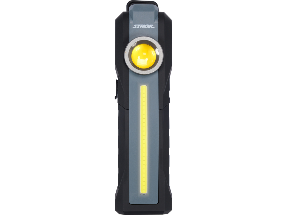 Lampă de atelier cu trei surse de lumină. Poate fi agățat de un cârlig sau clemă sau atașată de banc folosind magnetul din bază. Unghiul de iluminare poate fi reglat datorită carcasei rabatante. Tipuri de funcționare: lanternă LED de putere - diodă COB rotundă - diodă COB lungă.