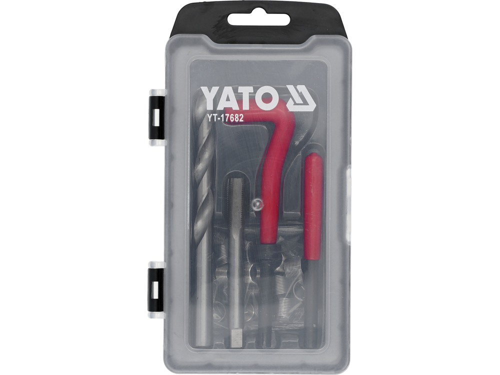gwintownik jednostopniowy do wykonania gwintu pod nową wkładkę, wkład spiralny x25 (M10x1.0), pokrętło do wkręcenia wkładek spiralnych, wybijak, wiertło do rozwiercenia uszkodzonego gwintu,
