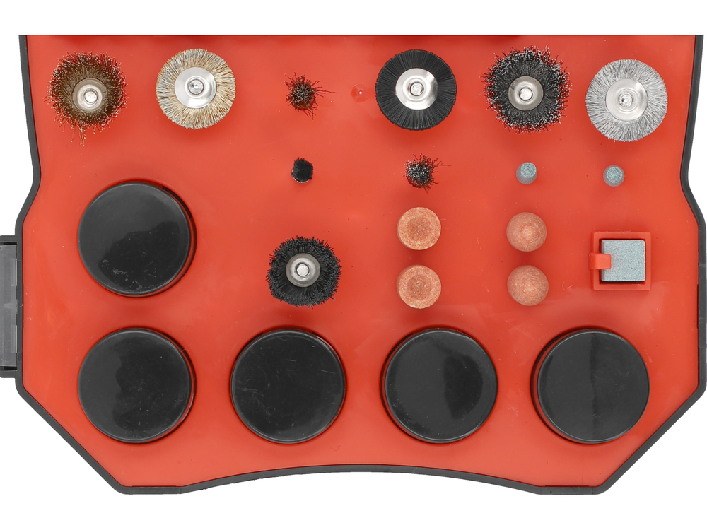 frez HSS x2 (Ø3.2 mm), osełka, filc x5 ((Ø6.3x12.7 mm), filc x5 Ø6.3x25 mm), szczotka stalowa x3 (Ø3.2 mm), szczotka nylonowa x3 (Ø3.2 mm), szczotka druciana medziana x3 (Ø3.2 mm),