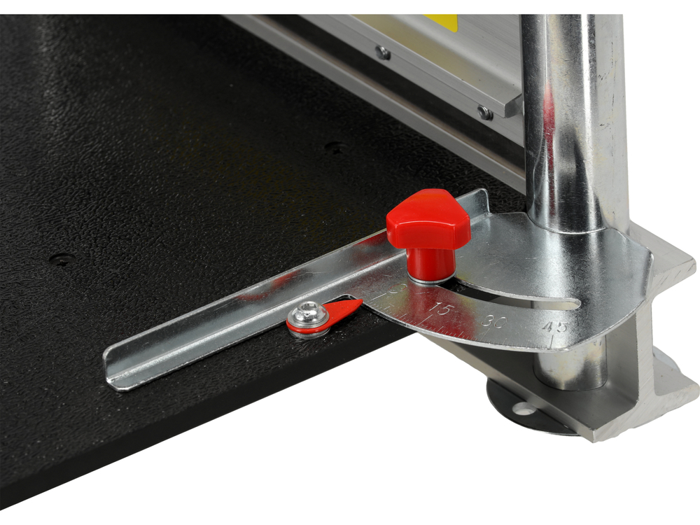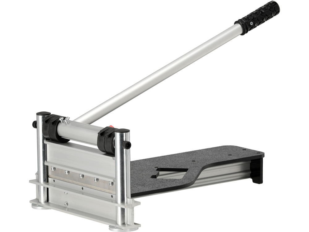 Guillotine pentru tăierea panourilor de pardoseală, cu lățimea de tăiere de 230 mm și grosimea maximă a materialului de 15 mm. Cuțitul gilotinei este montat în profile de aluminiu, fixate pe picioare verticale din oțel. Brațul de fixare are o lungime de aproximativ 650 mm. Placa de lucru este fabricată dintr-un material durabil și rezistent la uzură, cu dimensiunile de 460 mm x 650 mm. Pe placă este integrat un unghiular care permite tăierea sub diferite unghiuri: 15°, 22,5°, 30° și 45°.