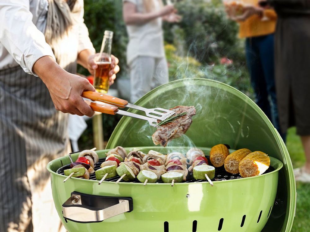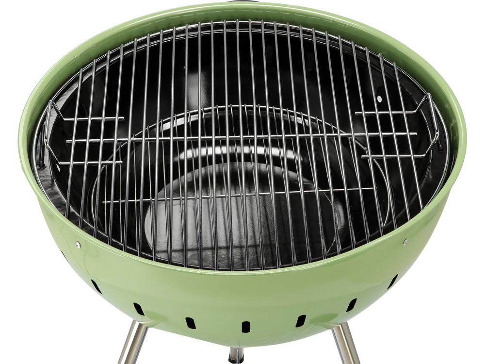 Grătar portabil cu cărbune cu grătar cromat și cu o cameră de ardere închisă cu capac. Construcția ușoară și roțile asigură libertatea de a muta grătarul în orice loc de pe terasă sau din grădină.