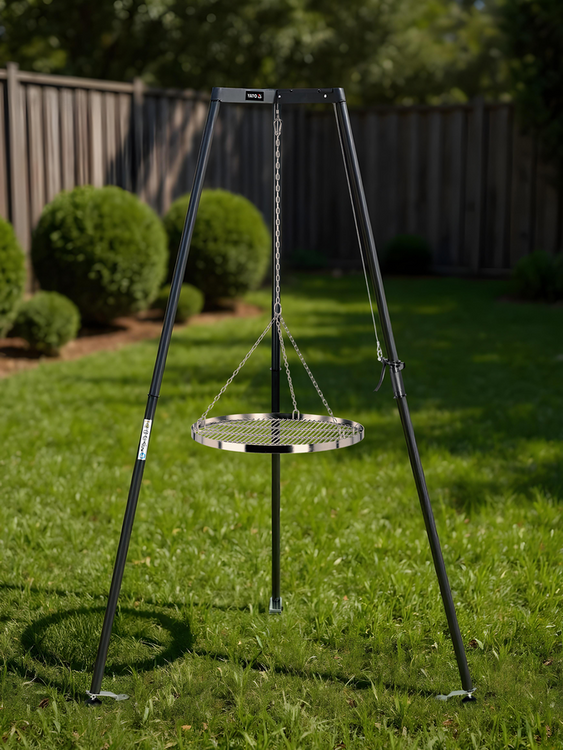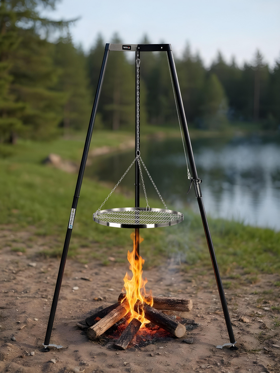 Călcâi portabil din oțel cu grătar pentru grătar. Construcția ușoară permite mutarea grătarului în orice loc.