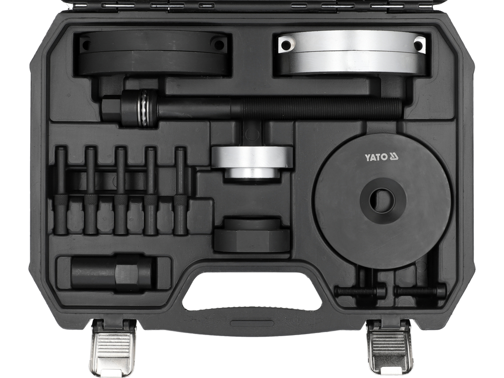 Setul de scule pentru demontarea și asamblarea ansamblului rulmentului și butucului la mașinile VW, Audi, Seat, Skoda. Reduce riscul de deteriorare în timpul lucrărilor de service, datorită unghiului corespunzător de lucru. Nu necesită demontarea elementelor de suspensie.