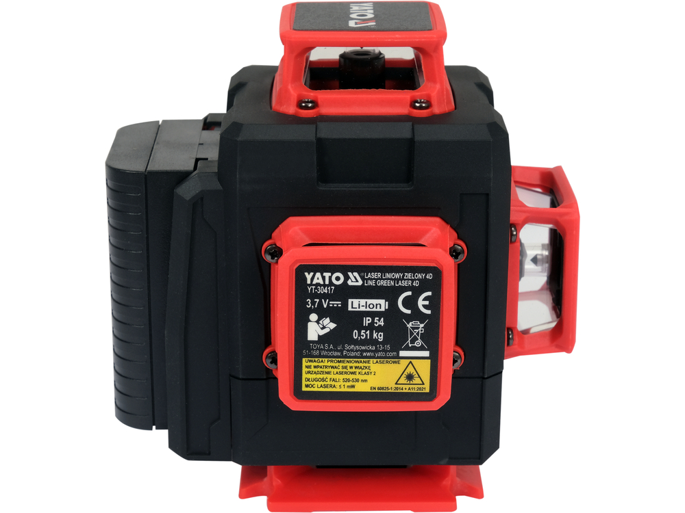 Laserul funcționează cu o baterie cu capacitate ridicată de până la 4000 mAh. Prezența a două baterii în set permite o funcționare continuă pentru o perioadă mai lungă. Carcasa din plastic rezistent, cu clasă de protecție IP54, cu inserții antiderapante din cauciuc, garantează rezistența la praf și picături de apă din orice direcție.
