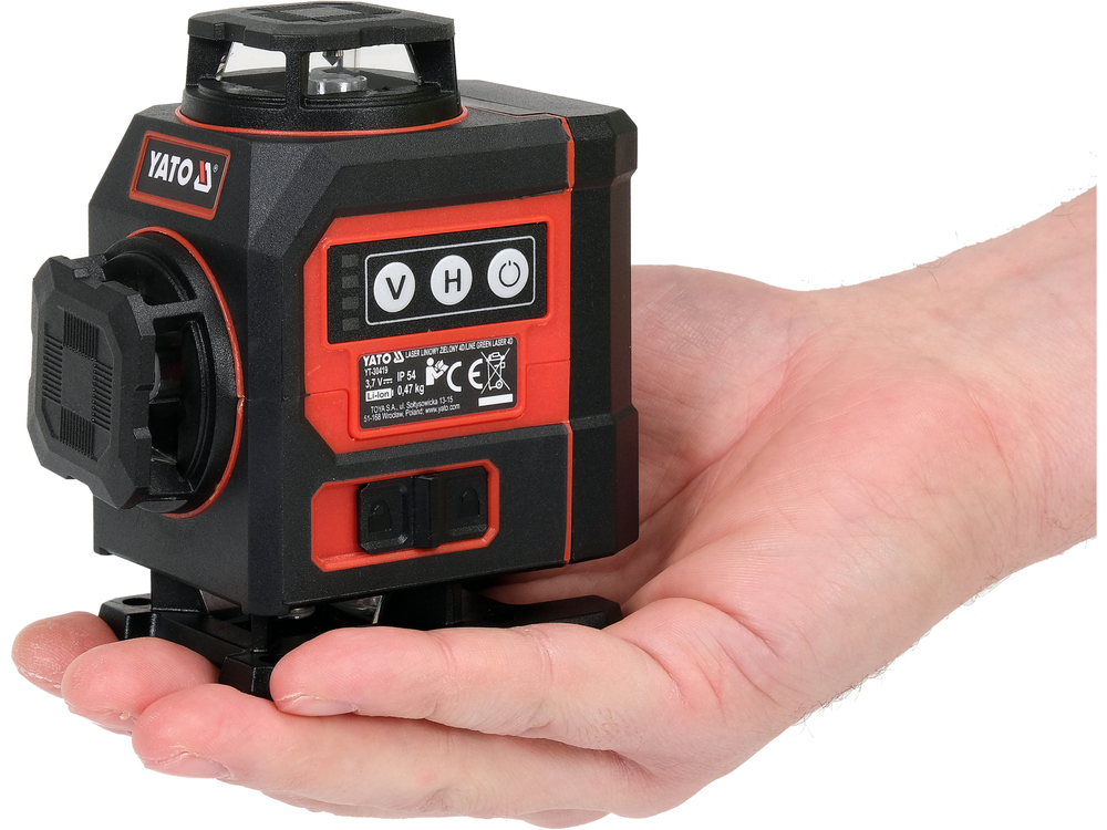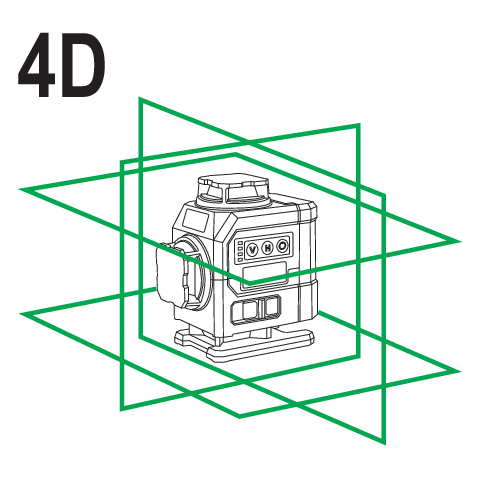 Laser autonivelant cu patru planuri 4D în versiune mini cu fascicul verde. Proiectează 16 linii, câte patru pe fiecare plan. Permite obținerea nivelului și verticalului pe fiecare perete simultan în timp real.