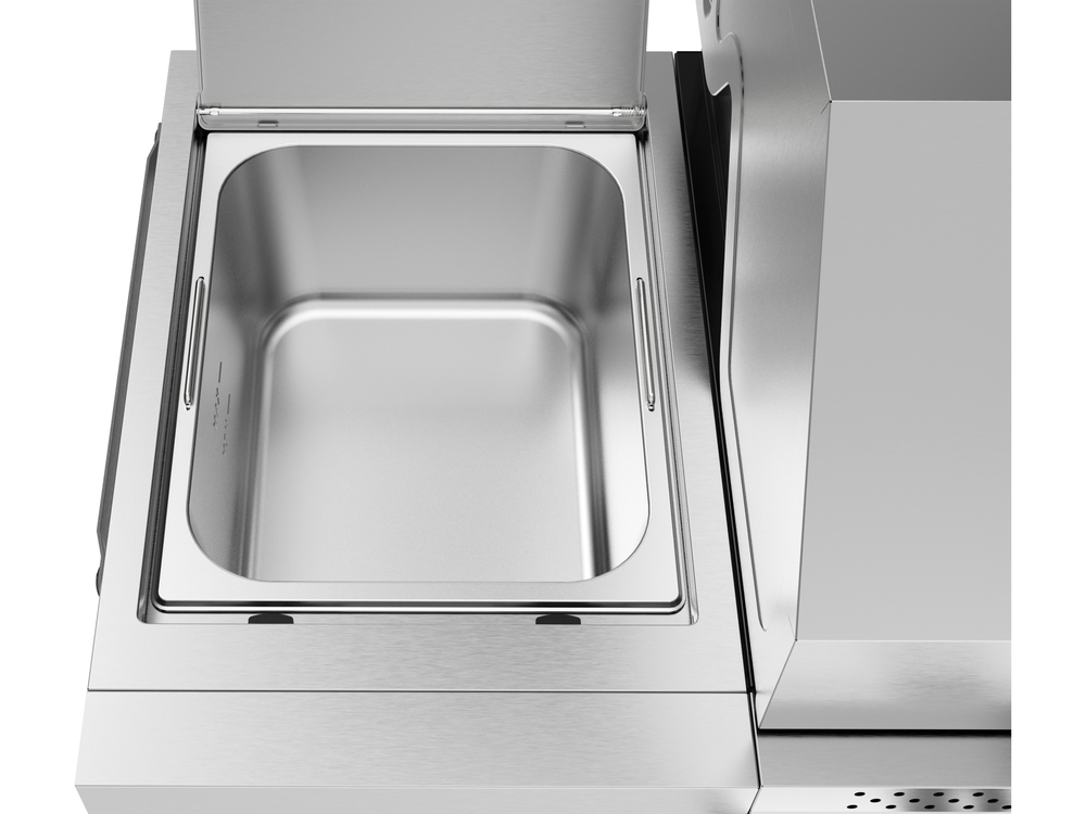 - rafturi laterale echipate cu o placă de tăiere din lemn extensibilă și un recipient din oțel pentru depozitarea ingredientelor sau a preparatelor gata făcute