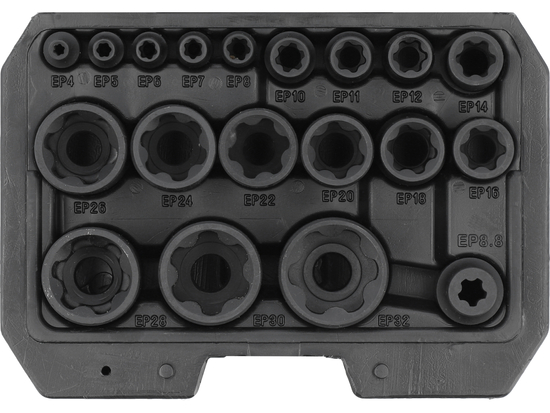 Set de capete externe specializate Torx Plus (EP) care permit demontarea și montarea elementelor de fixare, inclusiv a celor non-standard, folosite în multe vehicule moderne. Capetele Torx Plus oferă o suprafață de contact mai mare cu mufa, asigurând o prindere mai sigură și o lucrare mai sigură și eficientă cu elementele de fixare cu care capetele Torx standard nu fac față.