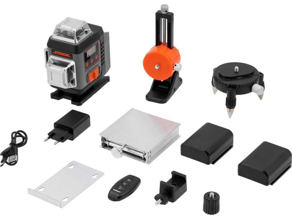 laser, akumulator x2, ładowarka, pilot, uchwyt ścienny, mocowanie do uchwytu, adapter do statywu, podstawka obrotowa, płytka metalowa, platforma regulowana góra-dół