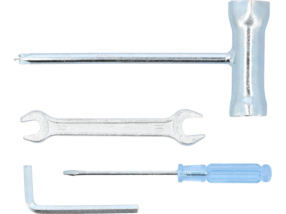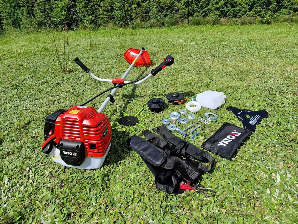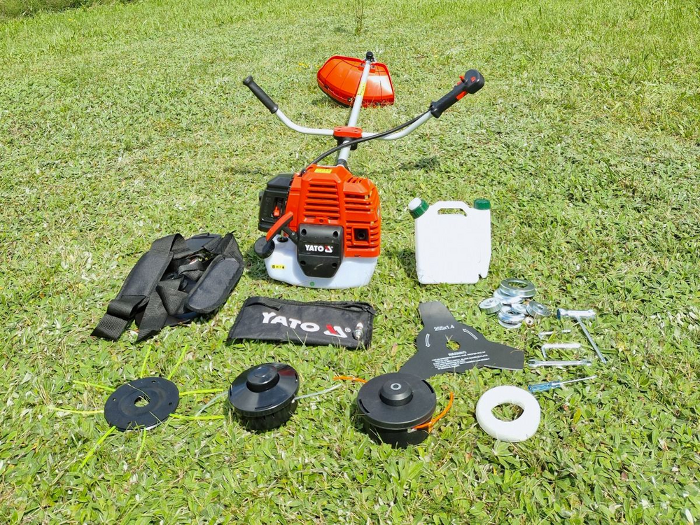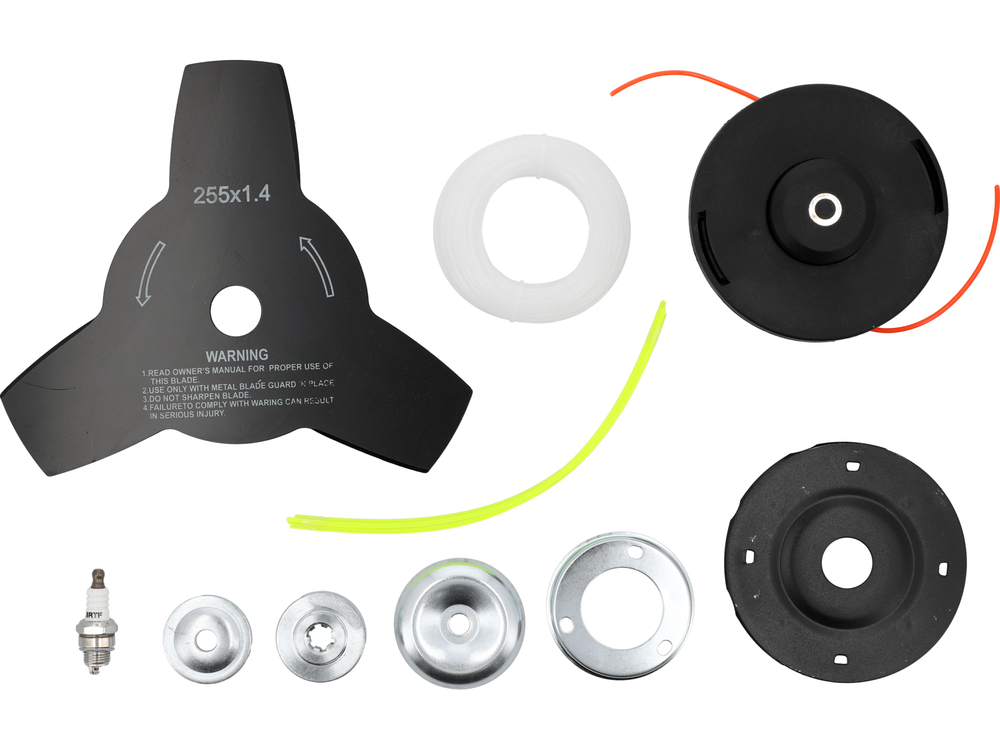 kosa, nylonowa głowica żyłkowa x2, metalowa głowica żyłkowa, ostrze trójzębne, żyłka, świeca zapłonowa x2, zbiornik na mieszankę paliwową, nóż do osłony kosy, zestaw narzędzi, podwójna uprząż