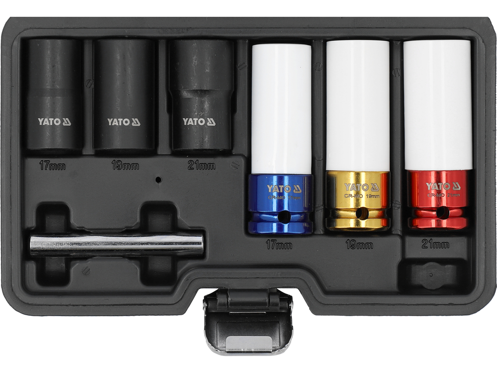 Set profesional de capete de impact și șurubelnițe adaptat pentru cele mai mari încărcături de impact și pulsante. Destinat pentru utilizare în service-uri auto și ateliere vulcanizare pentru desfacerea și strângerea piulițelor roților și scoaterea tijelor, bolturilor și manșoanelor blocate în jantele de aluminiu.