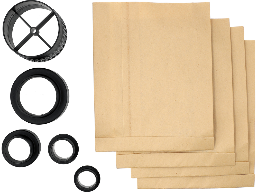 odciąg wiórów, wąż elastyczny (Ø100 mm), końcówka węża x2, filtr, worek filtrujący, adapter