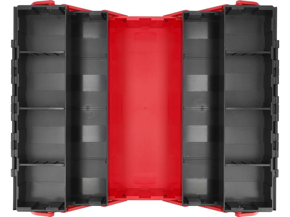 Echipată cu cinci rafturi spațioase - o cameră principală și câte două laterale - permite aranjarea comodă și accesul rapid la elementele necesare. Cu o capacitate maximă de încărcare de 30 kg, cutia va putea să încapă fără probleme uneltele manuale, accesorii mici sau elemente de montaj.