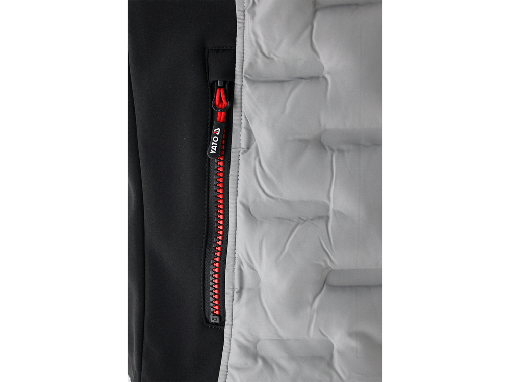 Materiale de înaltă calitate, inclusiv corpul matlasat și inserțiile elastice tip softshell cu laminare TPU, rețin eficient căldura, protejând părțile vulnerabile ale corpului fără a limita mobilitatea. Elementele reflectorizante de pe umeri cresc vizibilitatea în condiții de iluminare redusă, sporind siguranța în timpul lucrului în exterior sau în halele industriale. Buzunarele plasate ergonomic și detalii practice, precum bucla pentru umeraș, facilitează depozitarea uneltelor și documentelor, precum și manipularea zilnică a îmbrăcămintei.