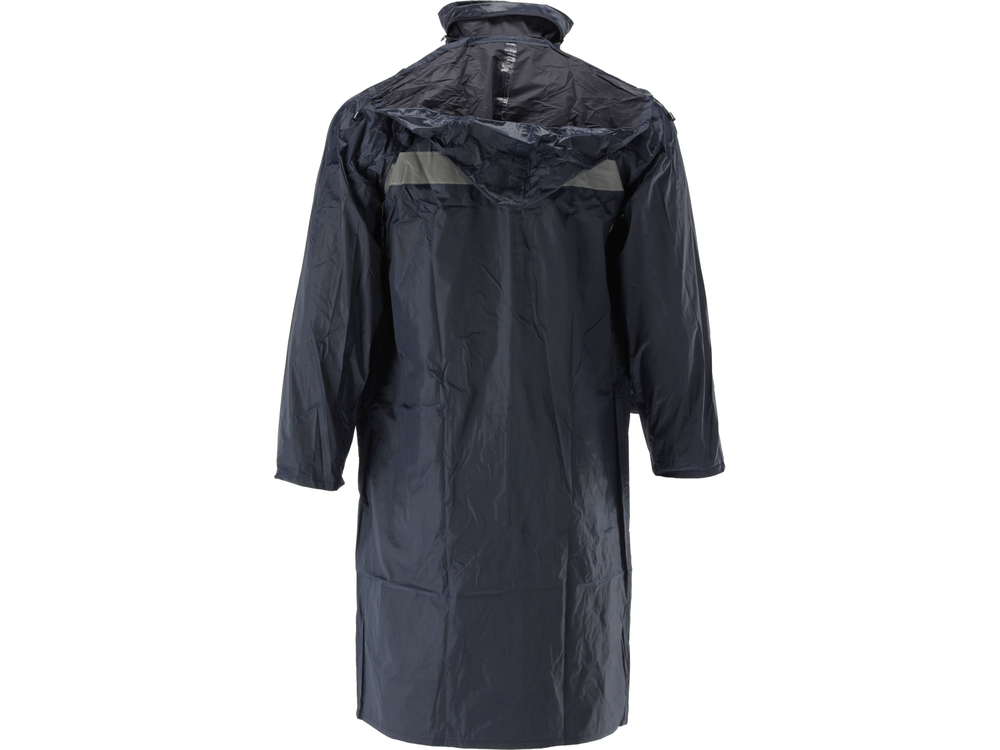Geacă ușoară de ploaie cu benzi reflectorizante pentru îmbunătățirea vizibilității, cu două buzunare mari și cu glugă reglabilă.