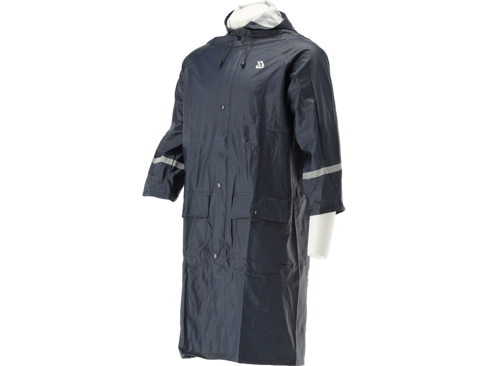 Palton de ploaie din material elastic, cu benzi reflectorizante pentru îmbunătățirea vizibilității, cu două buzunare mari și cu glugă reglabilă.